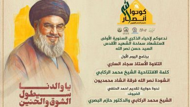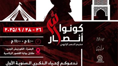 ” كونوا أنصار الله” البصرة على موعد معكم في مخيم ” النصر الإلهي “لإحياء ذكرى استشهاد سماحة الشهـ.يد الأقدس السيد حسـيـن نصـر الله (رضوان الله تعالى عليه)بتاريخ : ٢٦ – ٢٨ / ٩ / ٢٠٢٥ – الوقت : ٤:٠٠ م – ١١:٠٠ م