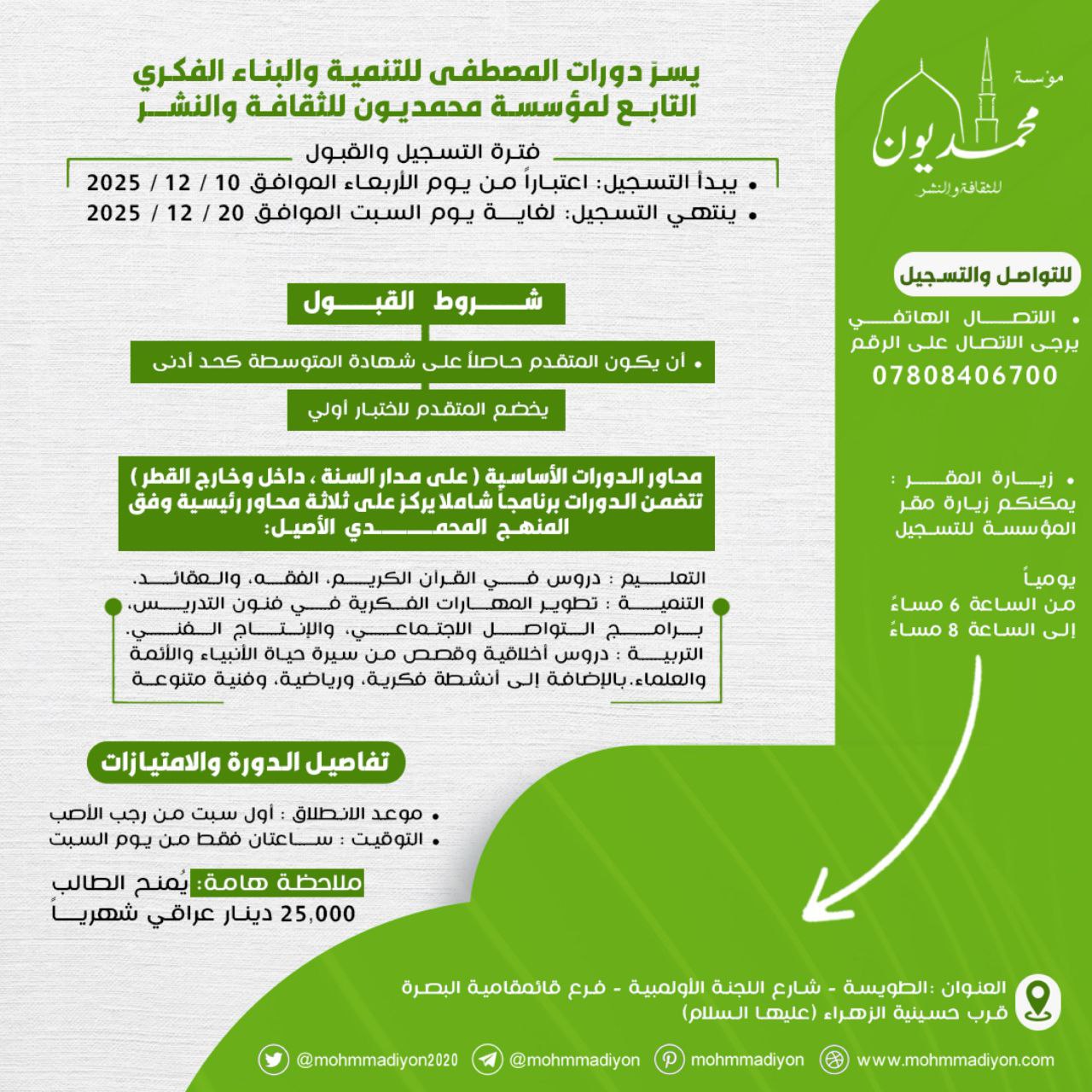 يسرّ دورات المصطفى للتنمية والبناء الفكري، التابع لمؤسسة محمديون للثقافة والنشر، أن يعلن عن فتح باب القبول في دورة الشباب المتميزة التي تستهدف الفئة العمرية من 15 إلى 25 سنة.
