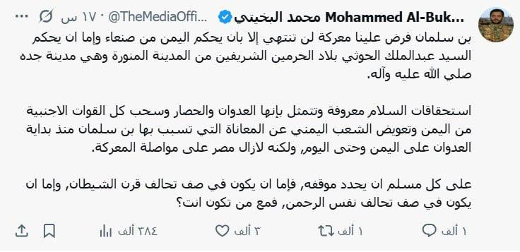احملوا الأمانة، وثقوا بالله، واعلموا أنكم اليوم الكهف الذي يأوي إليه المؤمنون، والجبل الذي يستند إليه المظلومون، واليد التي تعيد للجزيرة العربية كرامتها المسلوبة وعزّتها المنهوبة.