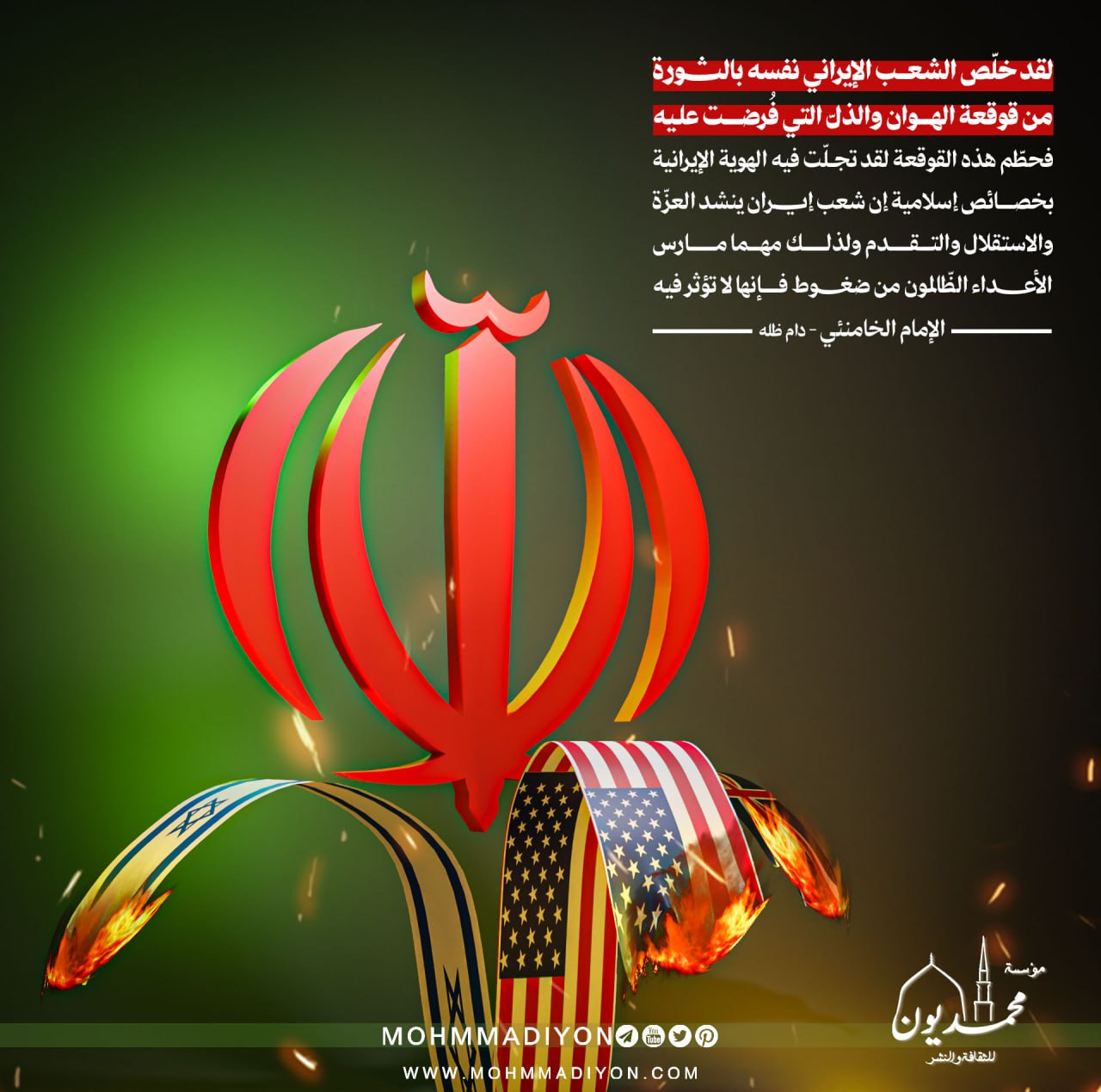 ” لقد خلّص الشعب الإيراني نفسه بالثورة من قوقعة الهوان والدلّ التي فُرضت عليه؛ فحطّم هذه القوقعة. لقد تجلّت فيه الهوية الإيرانية بخصائص إسلامية. إن شعب إيران ينشد العزّة والاستقلال والتقدم، ولذلك، مهما مارس الأعداء الظّالمون من ضغوط، فإنها لا تؤثر فيه “
