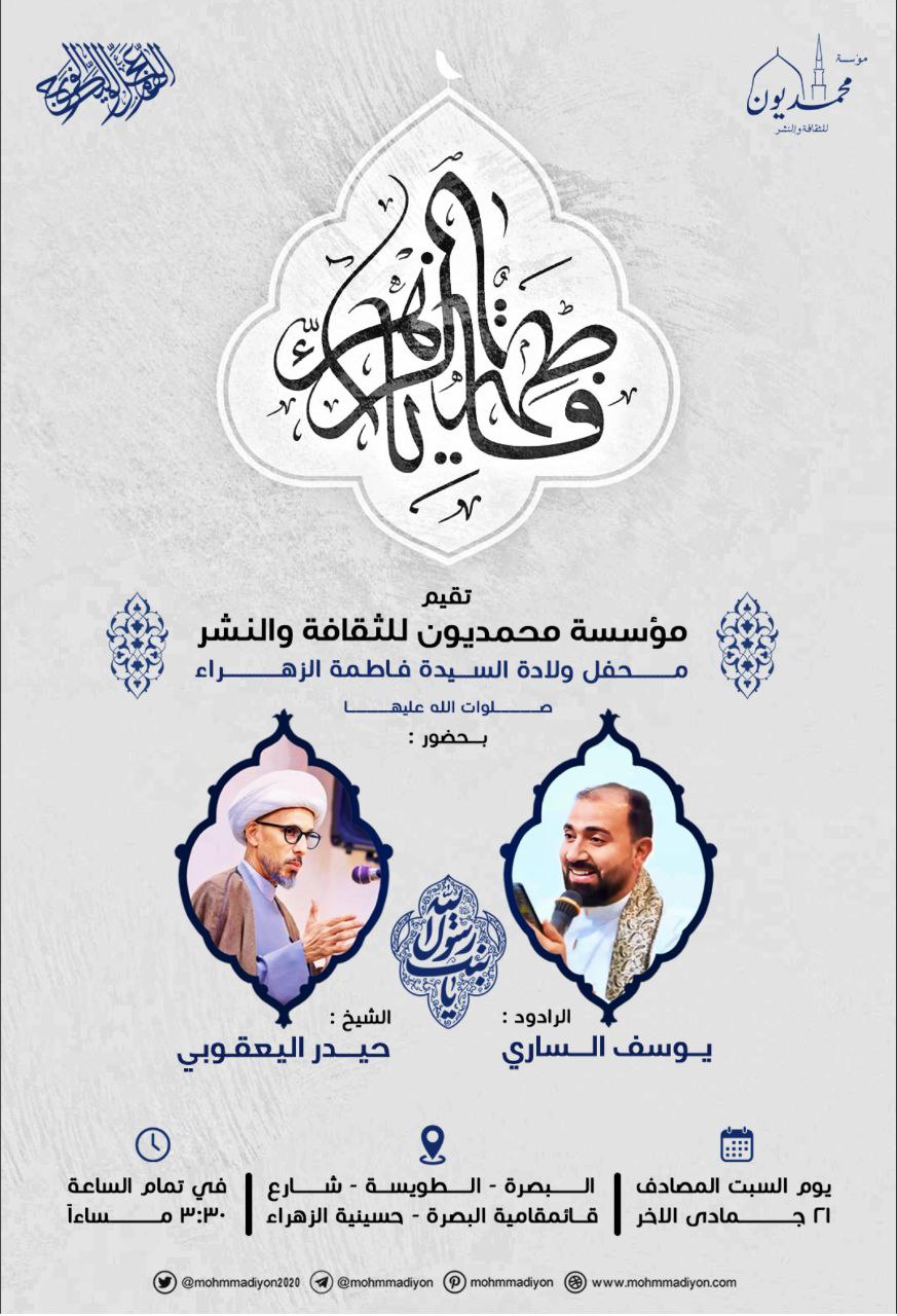 يسرُّ مؤسسة محمديون للثقافة والنشر أن تدعوكم إلى محفلٍ بهيج إحياءً لولادة سيدة نساء العالمين صلوات الله عليها.