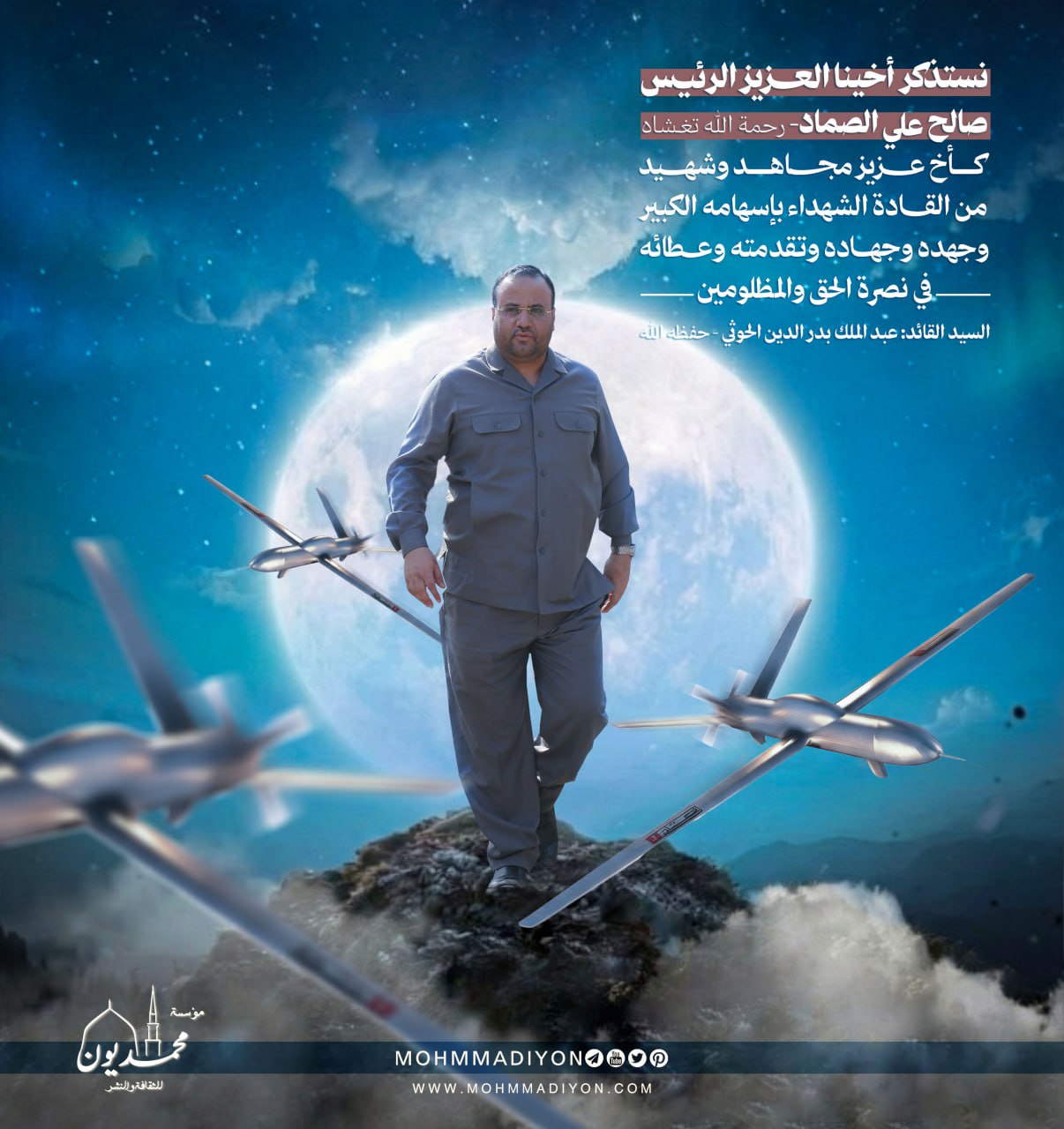 نستذكر أخينا العــزيز الرئيـس صالح علي الصماد- رحمة الله تغـشاه كــأخ عــــزيز مجاهـد وشــهـــيد من القــادة الشهداء بإسهامه الكبير وجهده وجهاده وتقدمته وعــطائه في نصرة الحق والمظلومين