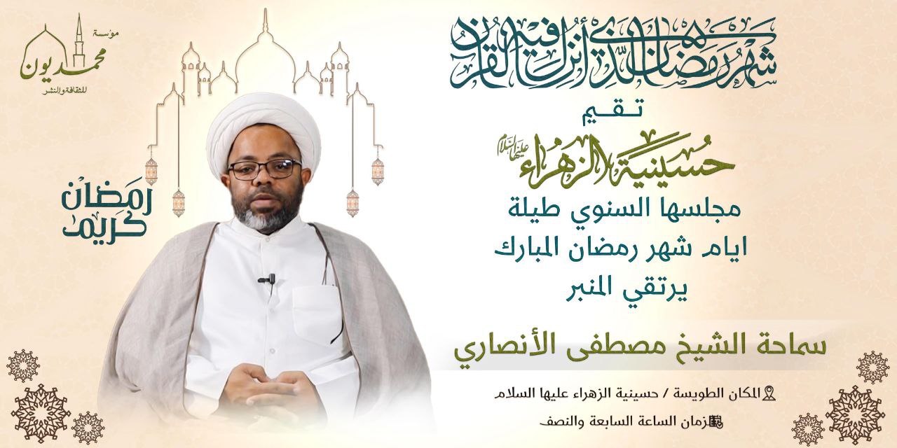 ﴿ شَهْرُ رَمَضَانَ الَّذِي أُنزِلَ فِيهِ الْقُرْآنُ هُدًى لِّلنَّاسِ وَبَيِّنَاتٍ مِّنَ الْهُدَىٰ وَالْفُرْقَانِ ﴾ ” تدعوكم مؤسسه محمديون الثقافه والنشر مجلسها السنوي طيلة ايام ( شهر رمضان المبارك) حيث يرتقي المنبر / سماحة الشيخ (مصطفى الأنصاري)