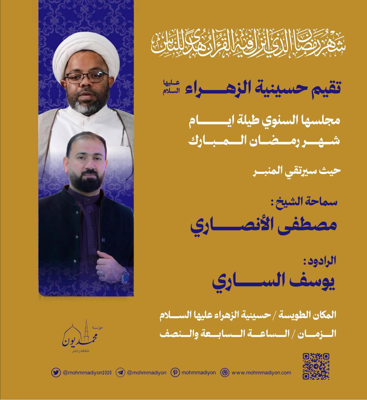 ﴿ شَهْرُ رَمَضَانَ الَّذِي أُنزِلَ فِيهِ الْقُرْآنُ هُدًى لِّلنَّاسِ وَبَيِّنَاتٍ مِّنَ الْهُدَىٰ وَالْفُرْقَانِ ﴾ ” تقيم حسينيه الزهراء( عليها السلام) مجلسها السنوي طيلة ايام ( شهر رمضان المبارك)