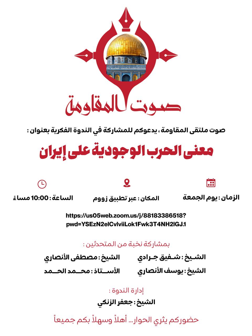 صوت ملتقى المقاومة يدعوكم للمشاركة في الندوة الفكرية بعنوان: “معنى الحرب الوجودية على إيران”