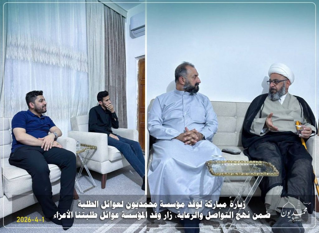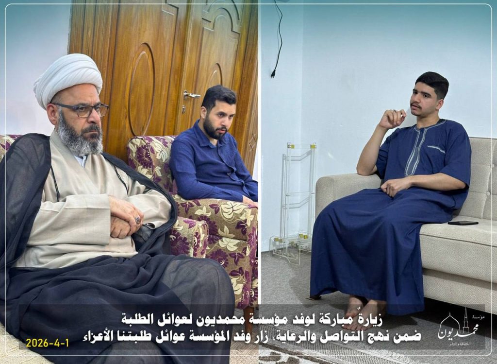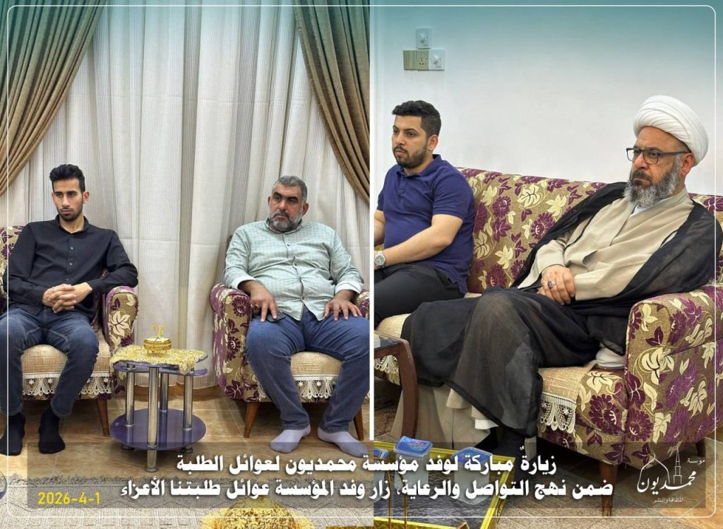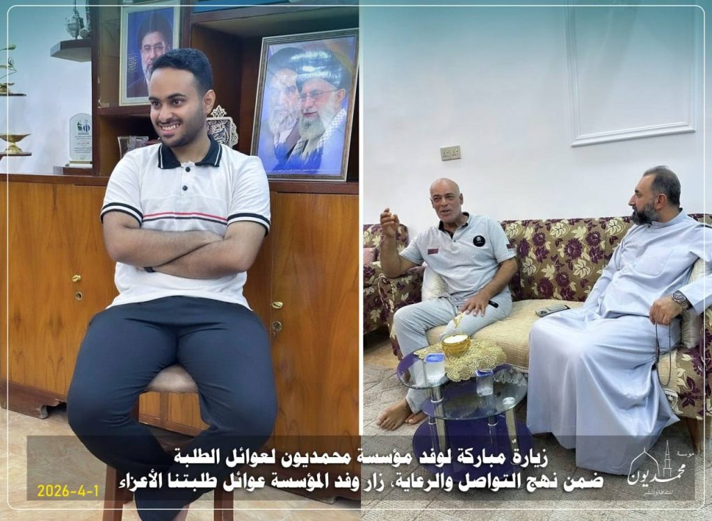 زيارةٌ مباركة لوفد مؤسسة محمديون لعوائل الطلبة “31-3-2026 ” ضمن نهج التواصل والرعاية، زار وفد المؤسسة عوائل طلبتنا الأعزاء: الحسن وحسين، ويوسف وعبد الله، في لقاءٍ جسّد روح الأسرة الواحدة، وعكس عمق الاهتمام والمتابعة.