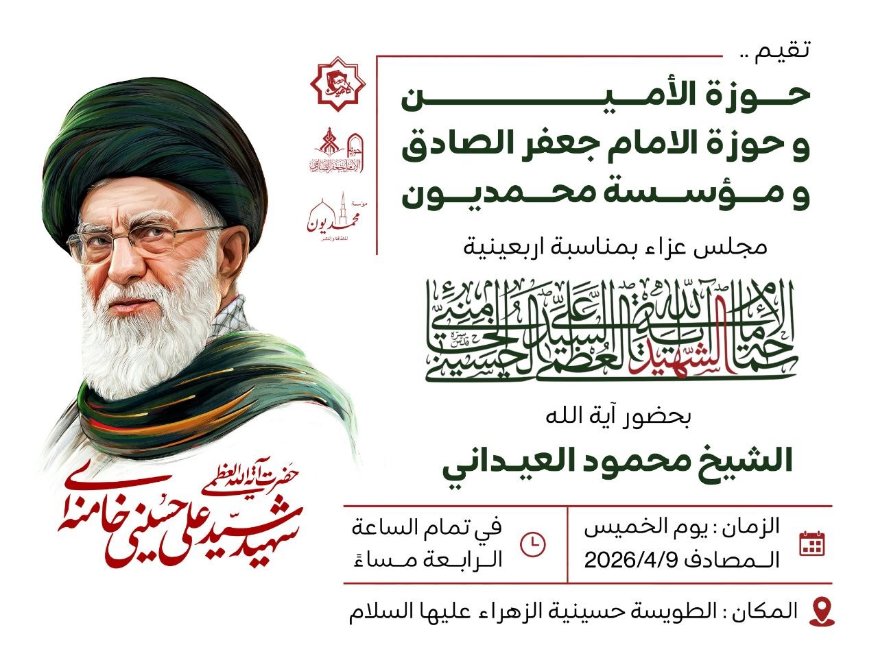 تقيم حوزة الامين و حوزة الامام الصادق و مؤسسة محمديون مجلس عزاء بمناسبة اربعينية اية الله العظمى الشهيد السيد علي الخامنئي قدس سره وبحضور اية الله الشيخ محمود العيداني