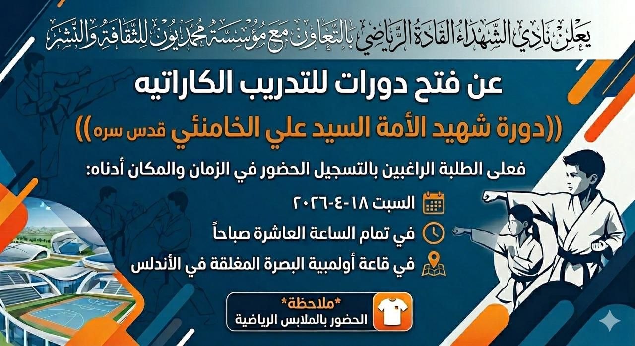 يعلن نادي الشهداء القادة الرياضي و بالتعاون مع موسسة محمديون للثقافة و النشر عن فتح دورات للتدريب الكاراتيه ((دورة شهيد الامة السيد علي الخامنئي قدس سره))