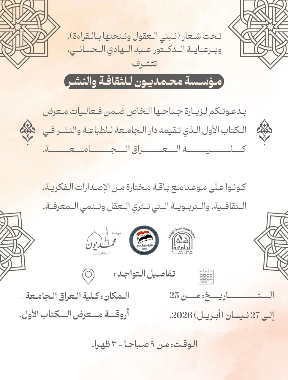 تحت رعاية الأستاذ الدكتور عبد الهادي الحساني المحترم، وإيماناً منا بأن الكتاب هو الحجر الزاوية في بناء الفكر الإنساني..تتشرف مؤسسة محمديون للثقافة والنشر بدعوتكم لزيارة جناحها الخاص المشارك في معرض الكتاب الأول، والذي تقيمه دار الجامعة للطباعة والنشر في رحاب كلية العراق الجامعة.