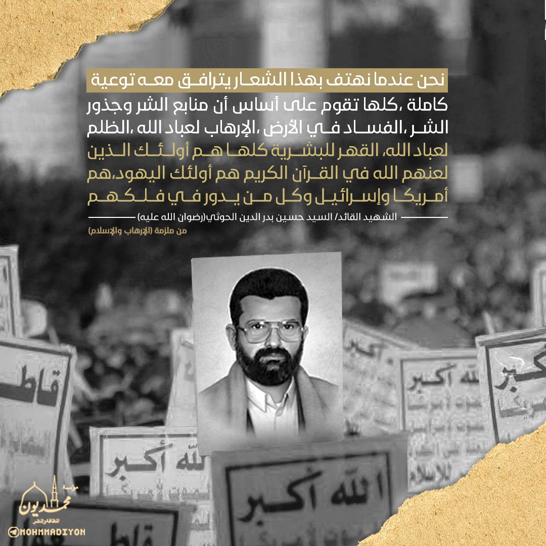 نحـن عندمـا نهتف بهذا الشعار يترافق معه توعية كاملة، كلها تقوم على أساس أن منابع الشر وجذور الشر، الفساد في الأرض، الإرهاب لعباد الله، الظلم لعباد الله، القهر للبشرية كلها هم أولئك الذين لعنهم الله في القرآن الكريم، هم أولئك اليهود، هم أمريكا وإسرائيل وكل من يدور في فلكهم.