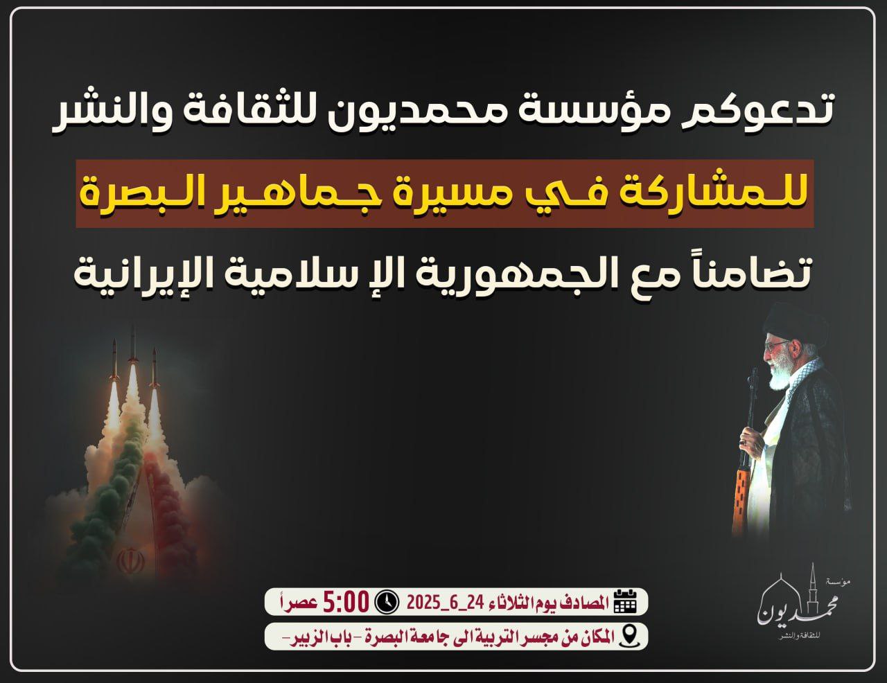 الرئيسية/أخبار المؤسسة/تدعوكم مؤسسة محمديون للثقافة والنشر للمشاركة في مسيرة جماهير البصرة تضامناً مع الجمهورية الإسلامية الإيرانية ، المصادف يوم الثلاثاء 2025/6/24 الساعة الخامسة عصراً ، المكان من مجسر التريبة الى جامعة البصرة – باب الزبير أخبار المؤسسة تدعوكم مؤسسة محمديون للثقافة والنشر للمشاركة في مسيرة جماهير البصرة تضامناً مع الجمهورية الإسلامية الإيرانية ، المصادف يوم الثلاثاء 2025/6/24 الساعة الخامسة عصراً ، المكان من مجسر التريبة الى جامعة البصرة – باب الزبير mohmmadiyonيونيو 22, 20250 82 أقل من دقيقة mohmmadiyonيونيو 22, 20250 82 أقل من دقيقة فيسبوك X لينكدإن Tumblr بينتيريست Reddit VKontakte مشاركة عبر البريد طباعة