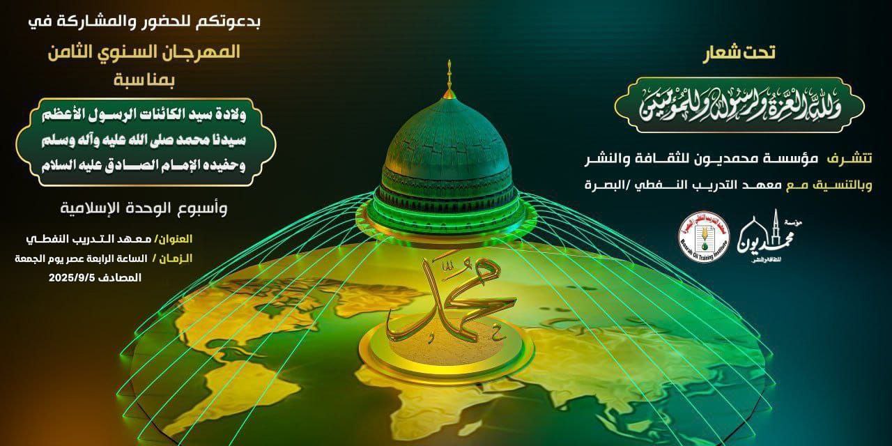 تحت شعار” وَلِلَّهِ ٱلۡعِزَّةُ وَلِرَسُولِهِ ۦولَلَمؤمنين” تتشرف “مؤسسة محمديون للثقافة والنشر”وبالــتنسيق مع “معهد التدريب النفطي” في البصرة بدعوتكم للحضور والمشاركة في المهرجان السنوي الثامن بمناسبة ولادة سيد الكائنات الرسول الأعظم سيدنا محمد ( صلى الله عليه وآله وسلّم ) وحفيدة الإمام الصادق ( علية السلام ) وأسبوع الوحدة الإسلامية