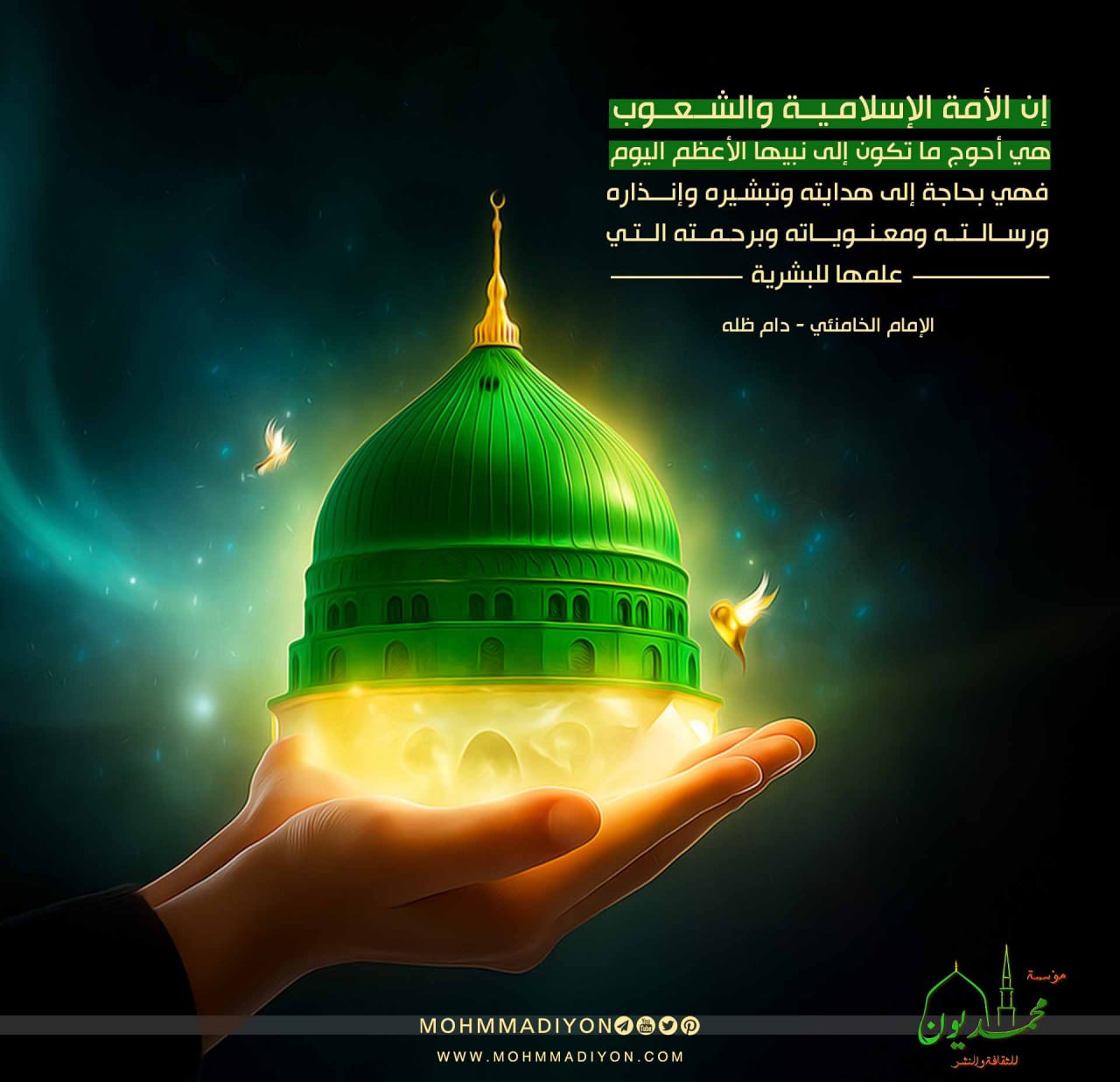 ” إن الأمة الإسلامية والشعوب هي أحوج ما تكون إلى نبيّها الأعظم اليوم. فهي بحاجة إلى هدايته وتبشيره وإنذاره ورسالته ومعنوياته وبرحمته التي علّمها للبشرية “